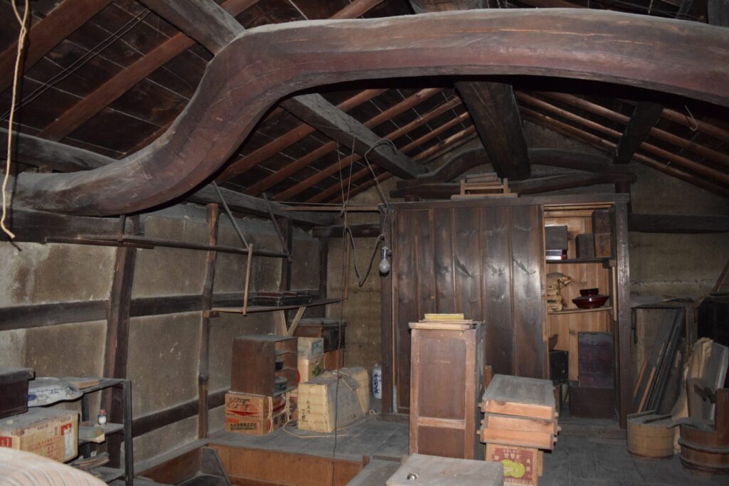 2階建切妻造、置屋根形式の桟瓦葺で正面に下屋を付す。奥行が深い平面を前後に分け、1階背面側は土間と和室を配し、2階は防火壁で画す。小屋組は曲がり梁を用いた和小屋。